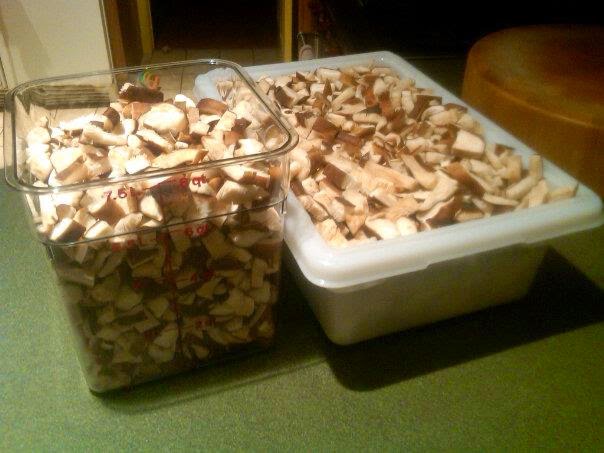 What in the world do you do with 20 pounds of Shiitakes?? The first thing is to eat a lot of them. They store well under refrigeration. Large caps are great stuffed with crab imperial and broiled, or sliced in thick slabs and breaded and fried with similarly prepared slices of squash and green tomatoes. Those crispy fried mushrooms, squash, and tomatoes are great to dip in hot sauce, and make a fine meal paired with fresh sliced tomatoes and corn on the cob.