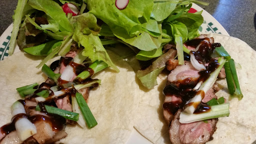 | Sous Vide Duck Taco with a fresh green garden salad |