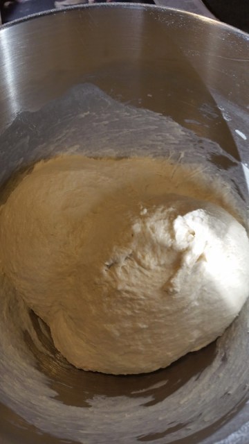 2. To the foamy mixture in the bowl, add the Tablespoon of sea salt and 2-1/2 to 3 cups of flour. Place dough hook on mixer and knead on speed 2. The trick is to get the dough to a point where it is just beyond sticking to the bottom of the bowl while the mixer is running. Add small amounts of additional flour with the mixer running to get to this point. Run the mixer until the gluten develops. A good indicator is when the surface of the dough is smooth. If you go too long, the dough will get gummy-looking; stop kneading immediately if this happens.