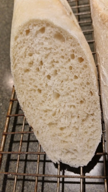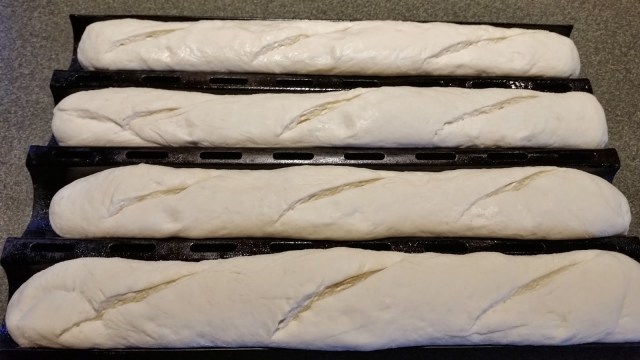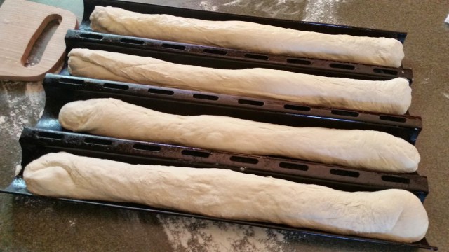 3. Shape the dough in a ball and re-cover the bowl with plastic wrap. Let rise until the dough is about to touch the plastic wrap. At this point, use a rubber spatula to turn the dough out of the bowl onto a floured surface. Use a knife to cut the dough into two equal pieces. Handle the dough minimally to shape into loaves. Place each loaf on a piece of parchment or in a baguette pan. Cover with a damp cloth towel. Let rise at room temperature for 2-4 hours.
