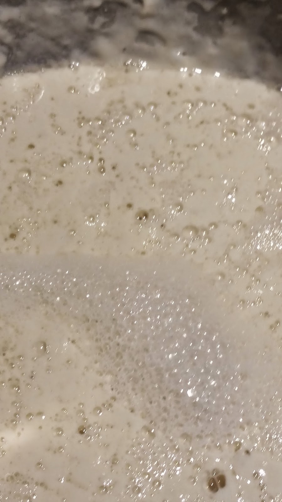 1. Add the cup of active sourdough starter to mixer bowl. Add 1-1/2 cups flour to bowl. Gradually mix in water with spoon to get it to a somewhat thick pancake batter consistency. Whip a lot of air into it. Yeast needs air to get it going. Cover bowl with plastic wrap and let rest at room temperature. It does not need to be warm; in fact, a cooler room will give better flavor. After 8 hours, the mixture should be foamy on top (if not, the starter is not active enough – may need more time or the starter may need a boost – another feeding cycle).