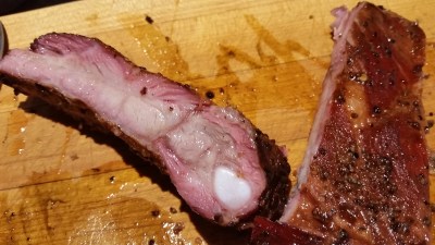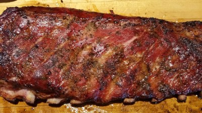 I can tell if the ribs are done by pulling at some of the meat near the end of a rack and by picking up a couple racks and seeing how they bend. If the meat is falling apart, they are overdone. If the ribs are tough and chewy, you need to slow down and not rush it. Sip on a beer while you bide your time for perfection. You want to be able to bite into the rib and leave teeth marks in the meat. The connective tissue should be broken down and fat should be melted. The bone should come clean when you have nibbled off all of the meat.