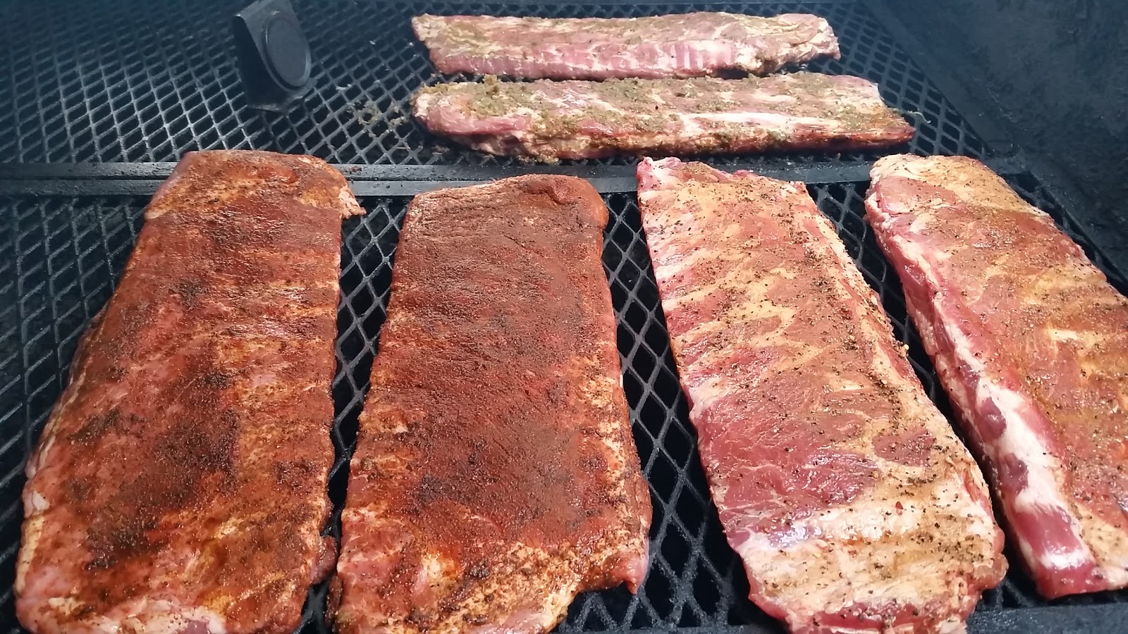 | Ribs on the grill. Can you read the temperature? Me neither. |