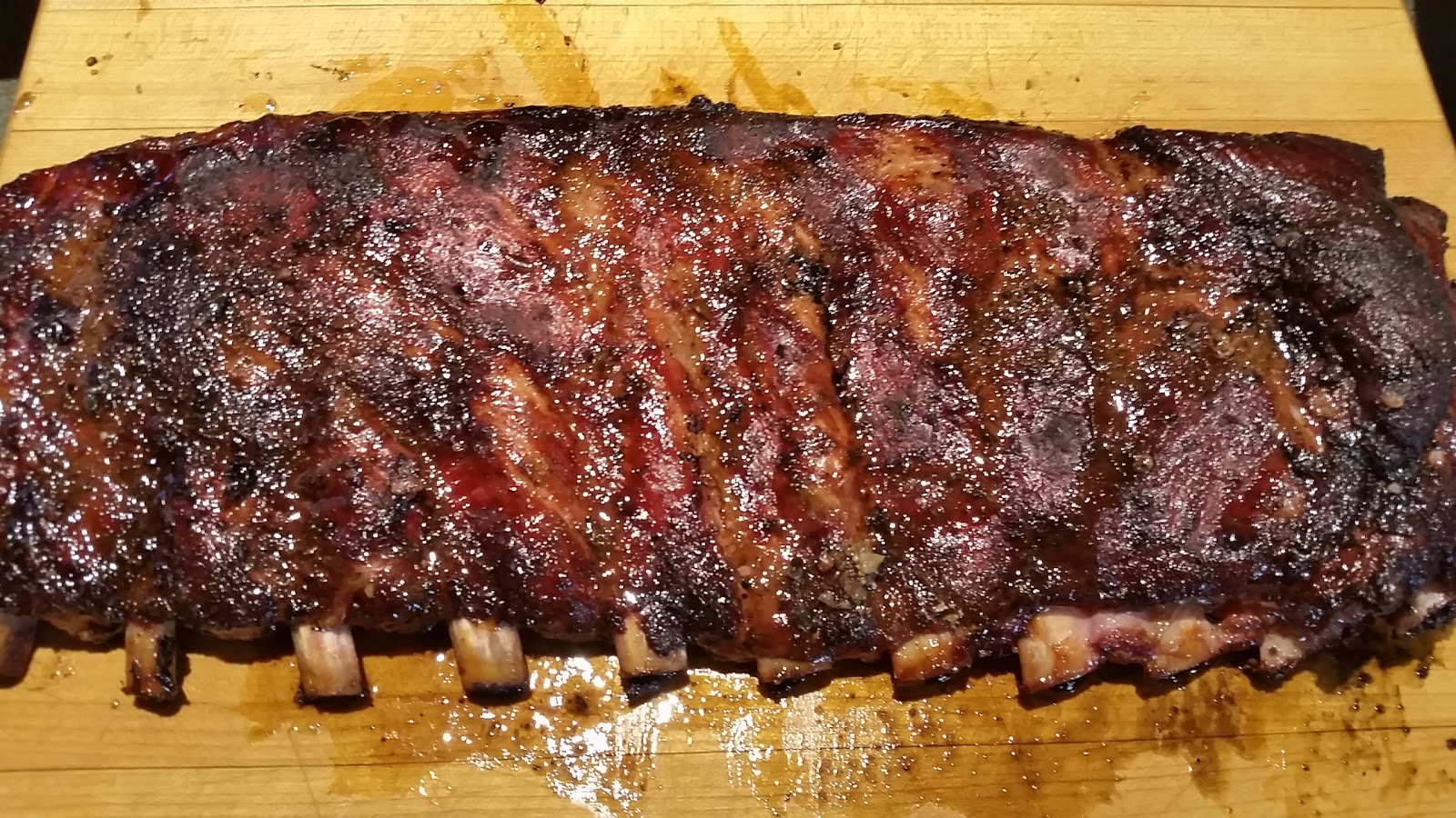 I can tell if the ribs are done by pulling at some of the meat near the end of a rack and by picking up a couple racks and seeing how they bend. If the meat is falling apart, they are overdone. If the ribs are tough and chewy, you need to slow down and not rush it. Sip on a beer while you bide your time for perfection. You want to be able to bite into the rib and leave teeth marks in the meat. The connective tissue should be broken down and fat should be melted. The bone should come clean when you have nibbled off all of the meat.