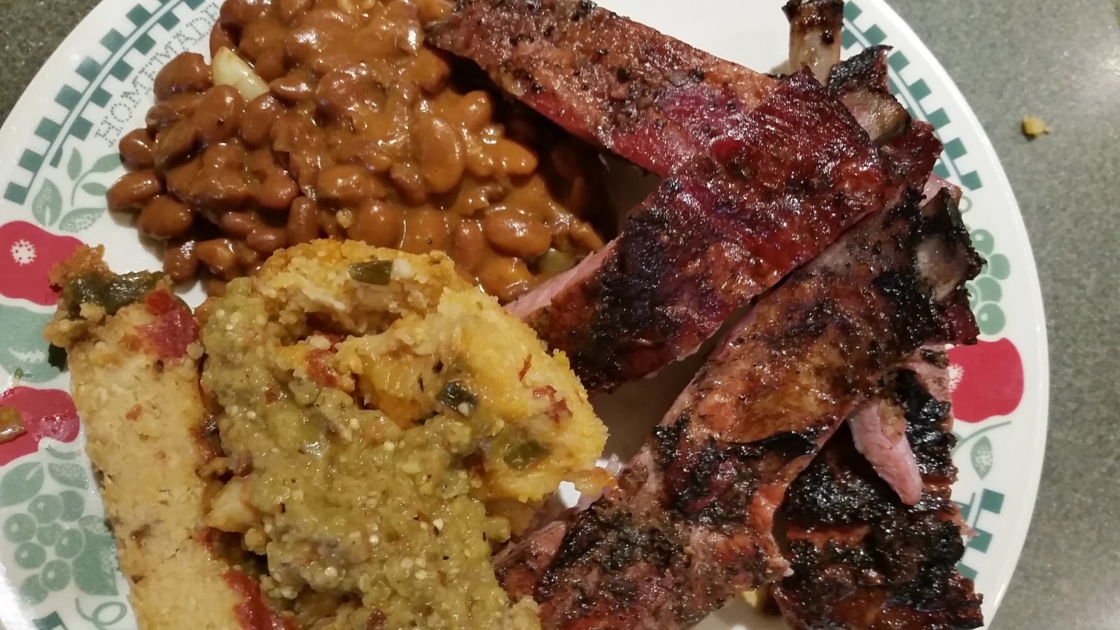 Chargrilled spare ribs, some fries made from potatoes from my dad’s garden, and beer. We were eating like kings on a pauper’s budget.