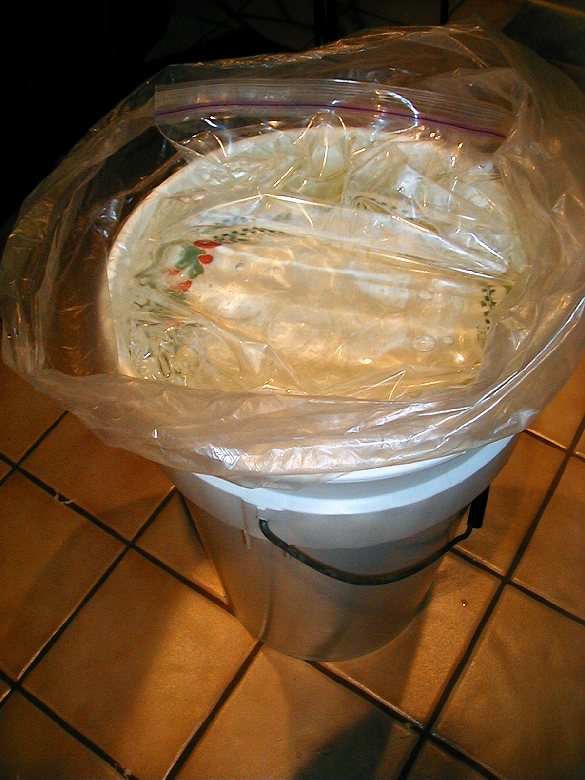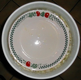 When all of the salted cabbage is packed into the fermentor, I place one of our finest pieces of dinner china on top of it to weight it down. You may choose to use your everyday china instead. On top of the plate, I place a large food-grade plastic bag. Inside the bag I place two two-gallon ziplok bags full of water to make a complete seal. The pressure of the bags against the inside rim of the bucket is sufficient to keep out debris and it prevents the kraut from being exposed to air. I have never had a problem with mold or wild yeast with this technique.