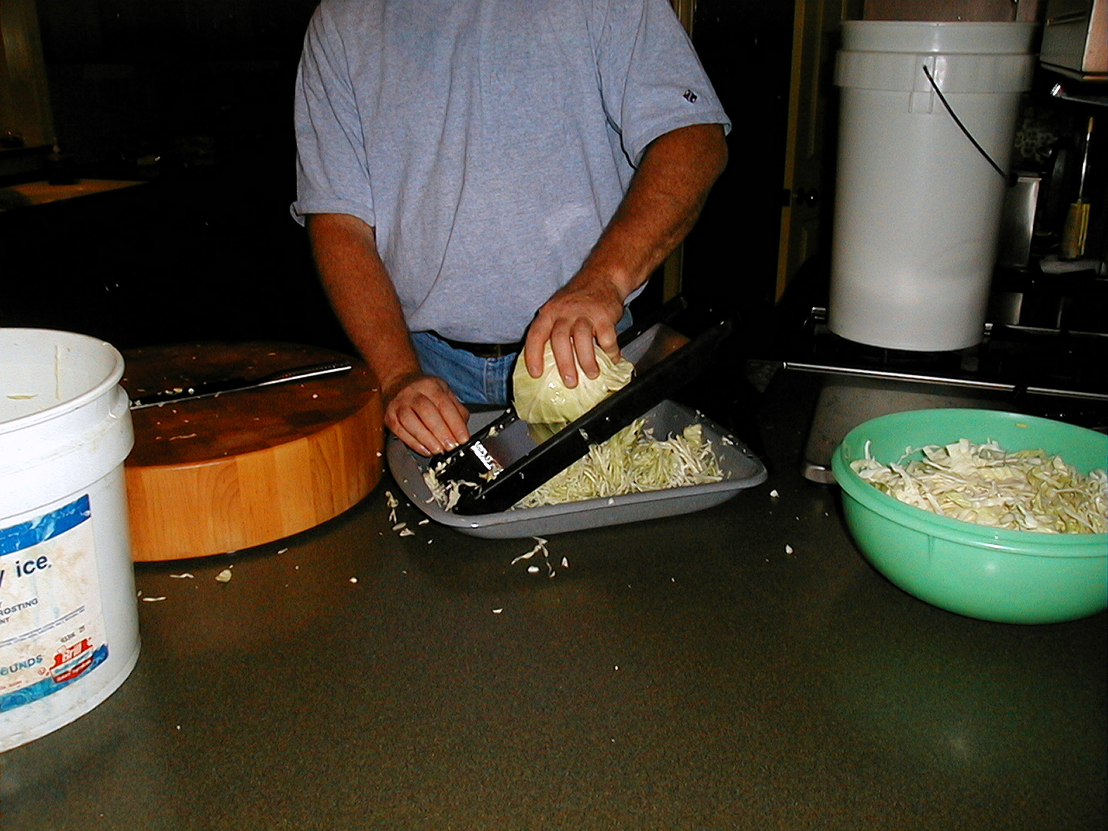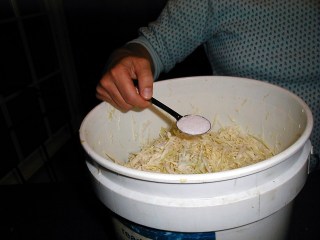 I slice the cabbage and put the cabbage slices into the mixing tray. Placing the tray on a scale makes it simple to work the five pound increments. Once I have five pounds in the tray, I measure out three tablespoons of pickling salt and sprinkle it over the shredded cabbage. Mix this thoroughly to ensure even salt distribution, then let it wilt for about five minutes. Dot comes back into action to punch the wilted cabbage into the fermentation bucket. It has to be packed tight with no air pockets. There should be a lot of juice present at this point, so getting the air out is usually not an issue.