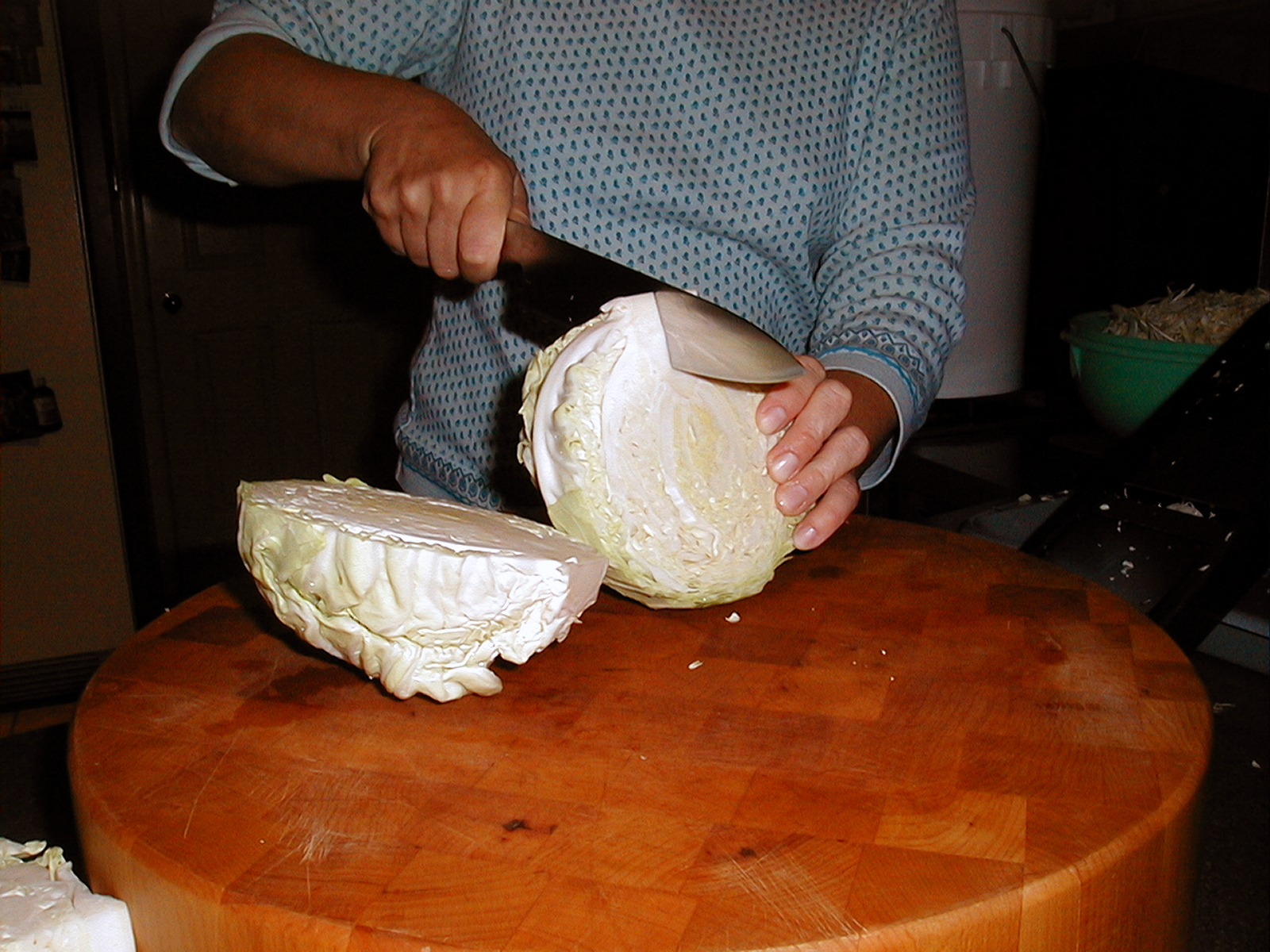 Cleaning the cabbage is a must. Dot pulls off the outer leaves, washes each head under cold running water, quarters the heads, and slices out the core from each quarter. Leave just enough core to hold the head together.