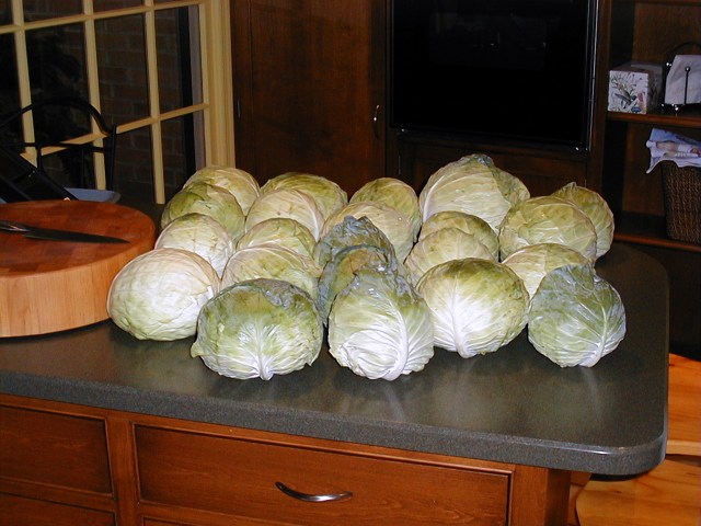 My wife, Dot, and I work as a team in making kraut. We buy a full case of cabbage for each batch. Local markets charge $10-12 for a nominal 50 pound case. Over the years we have gotten a lot of stares going into supermarkets and filling a cart with cabbage! 50 pounds makes about 14-18 quarts of finished kraut.