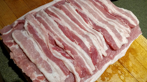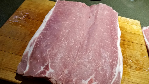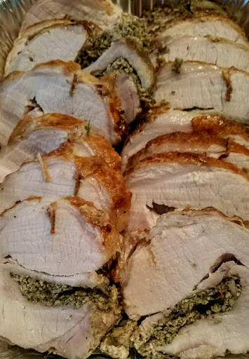 I finally had an idea of how to make this dish at home. I used a whole pork loin as the main cut of pork. I cut it in two equal pieces to make it easier to manage and cook. With the fat side up, I cut through the side of the loin to open it up like a book. Cut far enough into each half of the pork loin so that it lays flat as one equal thick slab. Next, I laid thin slices of fatty pork belly over the pork. Then layered that with the following mixture (half in each piece of the loin.)