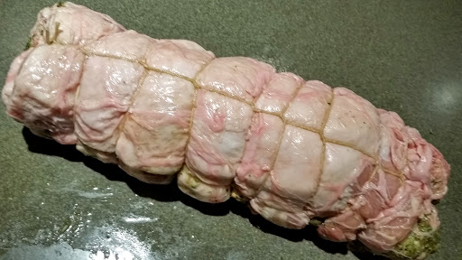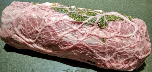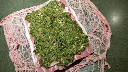 I then placed this pork covered with herb/spice mixture on a sheet of caul fat, rolled it up and tied up like a roast. If you have never tied a roast, there are plenty of videos on You Tube to show your how.