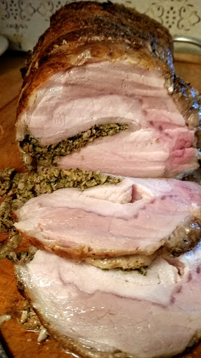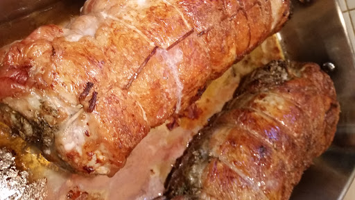 By now my blog readers must know that I had to make this at home. I made several versions using a boneless pork shoulder roast, trimmed and cut to make it as uniform in thickness as possible, then stuffed with a mixture of fennel, garlic, parsley, black pepper, and salt. The best versions were rolled up and tied, then cooked on the rotisserie of my Weber kettle charcoal grill. I also cooked a whole 50# pig with bones, stuffed with the herb and spice mix and then slowly barbecued on my Porkulator. This was also very good, but lacking the crisp exterior I sought.