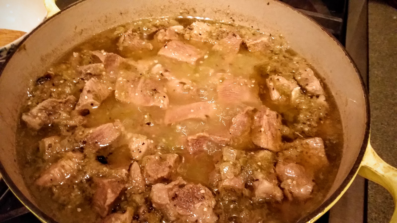Pour the pureed tomatillo mixture over the pork cubes in the Dutch oven. The pork should be entirely covered with liquid. If not, then add more water or roast pork stock to cover. Add the roasted chilies, stir the pot and bring to a good boil.