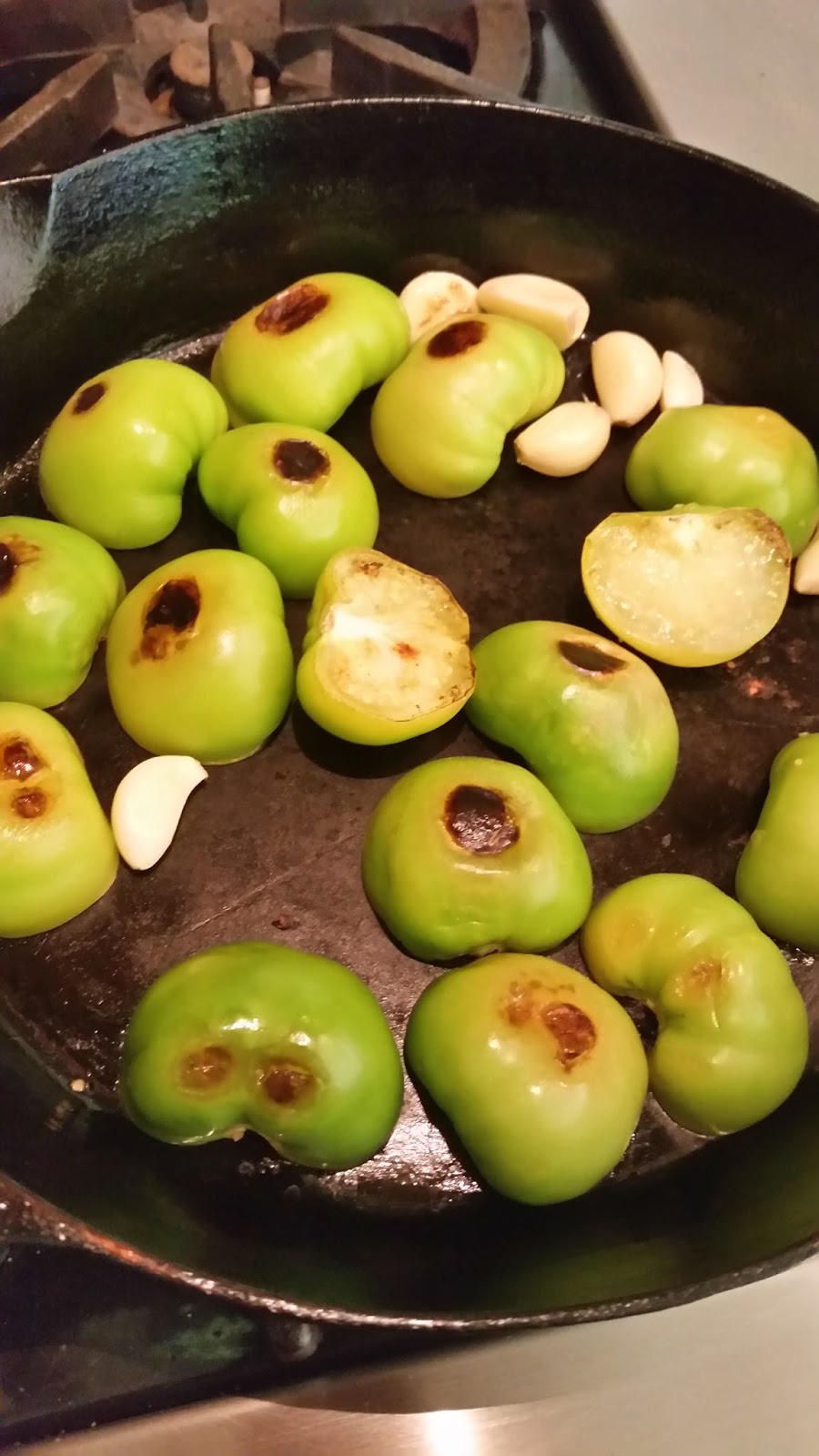 Next, reheat the heavy skillet over medium-high heat. Roast 4-5 cups of fresh tomatillos until they are black and blistered and the flesh is getting soft. If the tomatillos are large, roast in batches and cut them in half so the pan is not too crowded.