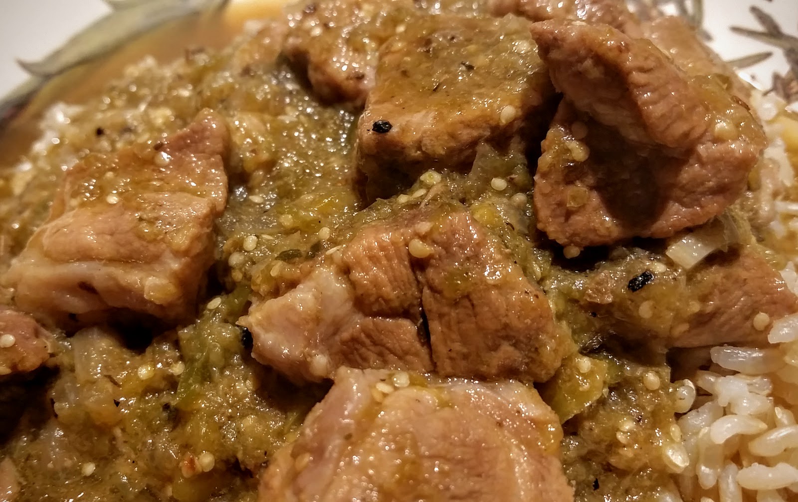 I like to serve pork chili verde over steamed brown rice, but it is good on its own, too. Garnish with grated cheese (low moisture mozzarella or Monterey Jack), sour cream, or slices of avocado with lime wedges.