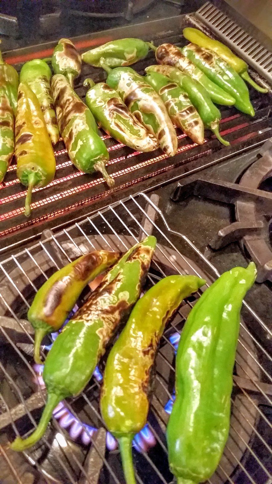 Next, roast 8-10 fresh green chilies over a grill or gas burner. I set a cake rack over a gas burner. When the chilies are black all over, place them in a bowl covered with plastic wrap or a kitchen towel. They need to steam for a few minutes. As soon as they are cool enough to handle, peel off the charred skin, slit the pods open and remove the seeds and core. I usually do this under a stream of cool tap water to wash away the seeds and bits of charred skin. Place the cleaned chilies in a small colander to drain. Coarsely chop the chilies and set aside. It should be about one cup of chilies. You can use hot or mild chilies as you prefer.