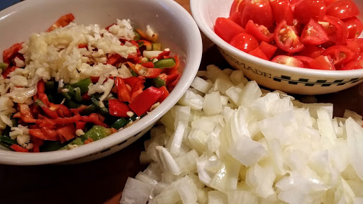Once the chorizo is cooked through, add in one chopped onion. Cook until it is getting tender. Then add 3T minced fresh garlic and one cup chopped fresh chilies. You may use any mix of chilies you like. I used half Anaheim type and half Serrano. I want heat! When the chilies are soft, then add ½ cup chopped tomatoes. At this point, taste to see if it needs any seasonings. I wanted my chorizo to come through, so I did not add any, but Mexican oregano, cumin, or chile powder are all very good additions if the pot needs more punch.