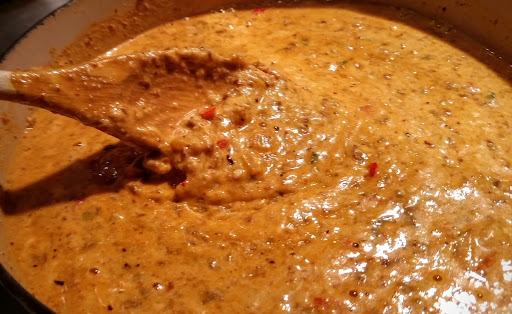 here). You can make your own or use cream cheese. Homemade is sharper. Then when the mixture comes together, start adding shredded Mexican blended cheese a cup at a time. Add more until the chili con queso gets to the consistency you want. I add about six cups.