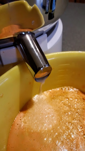 Then I break out the juicer. We have an Omega juicer. It’s great for extracting the juice from just about anything. It finely grates the fruit or vegetable matter, and then spins at high speed to separate the juice. For turkey, I assemble: