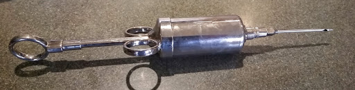 Now for the injection. Use an injector with a steel needle with two holes on the sides. When you poke the needle into the turkey, press down on the plunger as you move the needle back and forth. This will distribute the juice over a larger area in the muscle. When you pull the needle out, if the juice comes back out, then hold your finger over the hole to let the turkey absorb the injection for a couple of seconds. Inject each side of the breast 2-3 times. Each drumstick twice, in two spots along the bone, going in from the foot end. Each joint of the wing, and the meat where the wing is attached gets a shot. The thighs get 2 injections each. Inject along each side of the backbone. If you see any spots that look like they did not get hit, give a shot. When the level of juice in the bowl gets too low to suck up with the syringe, pour that juice into the cavity of the turkeys.