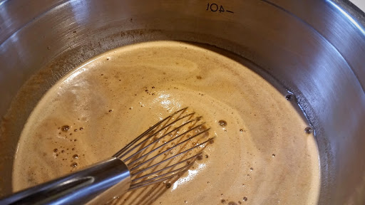 Whisk this liquid together with the wine and hot sauce mixture. Add 2-3T salt and a few turns of finely ground black pepper.