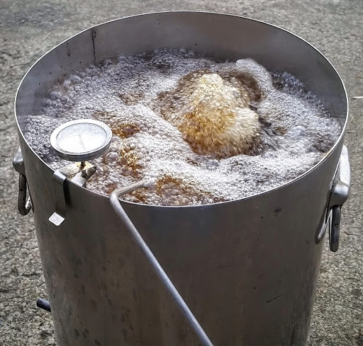 Heat the oil to 350F. Now is the only tricky part of this operation: putting the turkey in the oil. I recommend turning the flame off or reducing the flame to very low. Use oven mitts to hold onto the handle of the turkey stand (mine is detachable), and slowly lower the turkey into the oil. Watch how much it bubbles up. If it looks like the pot may boil over, raise the turkey. When the oil calms, lower the turkey again. Eventually, after several dips, you can fully submerge the turkey in the oil.