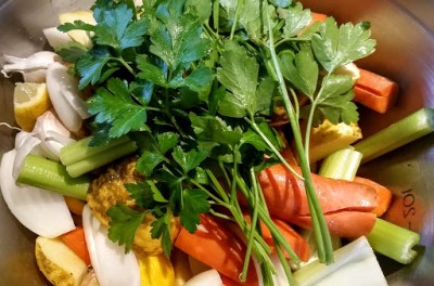 The injection liquid starts with a 750ml bottle of inexpensive Chardonnay. I add a five-ounce bottle of my homemade “Island Sherry Steak Sauce.” This sauce is made with Scotch bonnet chilies, sherry, catsup, soy sauce, lime juice, tamarind, brown sugar and mustard. Maybe a bit of rum, too. The flavor is similar to a commercial sauce called Pickapeppa, so you can use that instead.