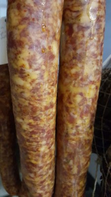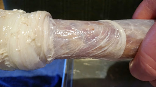 Normally salamis like this are stuffed into beef middles. We decided to use large 46mm+ hog casings so the salamis would be a bit thinner. Good for pizza, and good to speed the drying process.