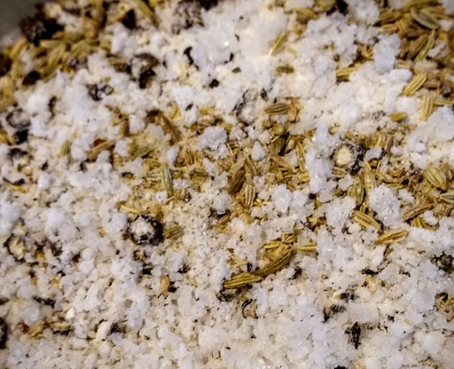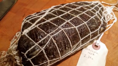 The first was a simple cooked ham. I boned two pork butts and rubbed the meat with 400g sea salt, 50g smoked salt, and 18g pink salt. I let it cure in my home fridge for 6 days flipping the package every day. Next, I rinsed it with wine, rubbed with some spices (black pepper, rosemary, and other Italian herbs), packed in netting, and then put it in the Saluminator for 3 weeks. I them simmered the netted meat in water for two hours, changed the water and did two more hours. I was going to smoke it, but it came out so good, we ate the first one as-is. It’s good as a cold cut or cut more thickly and cooked like a slice of ham to go with breakfast. Two butts made five netted pieces, so I still have more to play with.