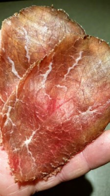 The Bresaola had lost 30% of its weight in about two weeks. It was a fairly small piece. It turned out a bit dry on the surface, so I vacuum packed the meat for a few days to equalize the moisture. The result is fantastic. I am going to make a lot of this. In Spring, when my wild arugula patch takes off, I will live on salads of arugula, bresaola, shaved Parmagiano Reggiano, lemon juice, olive oil, and black pepper. One of the best salads in the world!