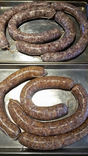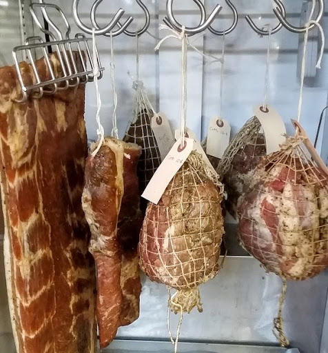 Jim cured a whole pork belly for pancetta. The belly is cured with salt, curing salt and spices, then is rinsed and dried and hung to age. The meat is weighed at the beginning of the aging process, and it is tagged with the date and weight. The meat is periodically weighed. When it has lost sufficient weight, generally 30%, but a bit less for fatty cuts (like the belly), it is ready to eat. It can be eaten without cooking, or can be used in any appropriate cooked dishes. I foresee some Rigatoni All’Amatriciana made with this pancetta!
