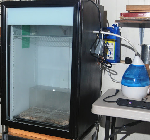 Jim picked up a thermostat controller to allow the fridge to be set to 55F. He drilled a hole in the side and piped in a small humidifier. A weather station tracks the inside temperature and humidity. Still working out the kinks, but it’s simple and effective. Jim put a small fan inside to circulate air and he put in a block of Himalayan salt to temper the humidity level.