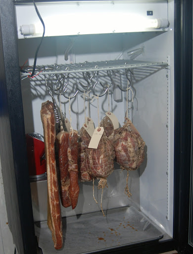 It’s time to introduce the newest member of the family. We call it “The Saluminator.” It’s a cousin to The Porkulator, our trailer barbecue. The Saluminator is a drying chamber for salumi (Italian, and the likely inventors of such things as claimed by my Italian friends), or charcuterie (as it’s known by the French). Either way, it is where cured meats go to age to perfection.