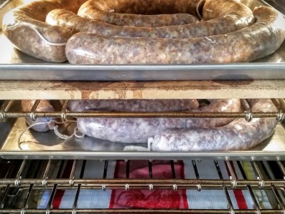 Both salamis include a bacteria culture called Bactoferm. The purpose of the bacteria is to ward off Botulism as well as to add a bit of twang to the salami. The bacteria need to inoculate. I put the freshly stuffed salamis on sheet pans and placed them in my convection oven with another sheet pan containing water and towels to humidify the oven. The inoculation needs 12 hours at about 80F and 80% humidity. My oven has a bread proofing setting that runs 100F, so I monitored the temperature and turned on the proofing feature every so often to hold 80F.