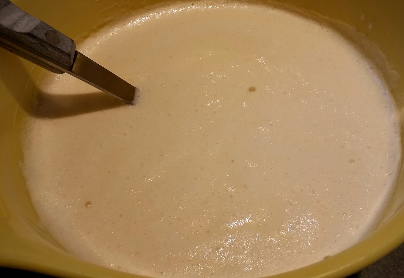 To the bowl containing the prior contents of the two jars, add about ½ cup flour and ½ cup water. Add to it: 2T sugar, 1t salt, 1/2t baking powder, 5T oil (I use grapeseed oil, but any neutral oil will work…you may also use butter or bacon fat if you prefer a different flavor. I am going for a clean sourdough flavor), and 3 egg yolks. Mix thoroughly. Put the 3 egg whites in a separate bowl and whisk until firm peaks form. Fold the egg whites into the batter. Mix 1/2 t Baking Soda into 1T water. Fold this into the batter. Be careful not to over mix at this point.