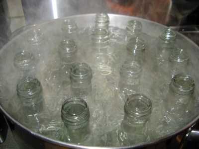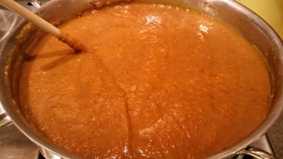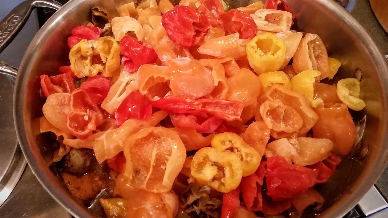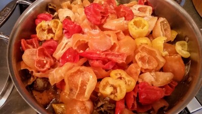 Cut two quarts (about 90 if you’re counting) habanero and Scotch bonnet chilies in half and remove seeds and stems. I usually freeze them to make them easier to manage; the seed cores pop out quickly. I used peach habaneros and yellow Scotch bonnets from my garden. Add the cleaned peppers to the simmering pot. Simmer about an hour.