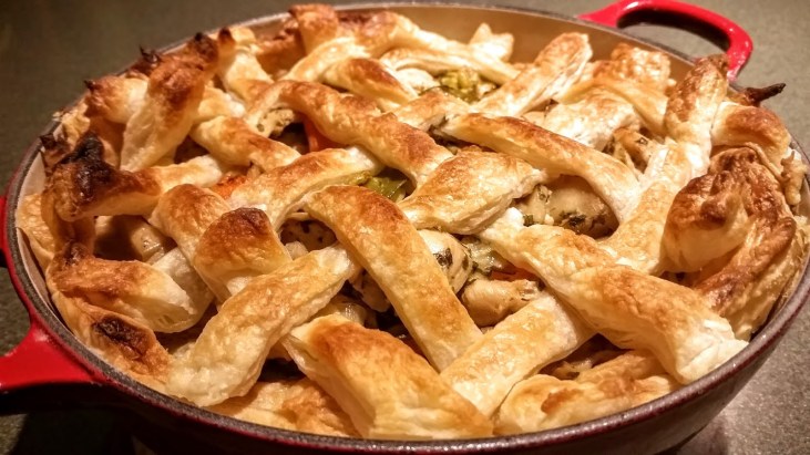 Ladle the mixture into the par-baked crust. Cut the remaining puff pastry into strips, and weave into a lattice to top the pie. Trim the pieces that overlap the casserole. Put the casserole back in the oven until the lattice puffs up and browns.