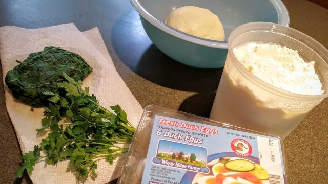 Dice the fresh mozzarella and put in a large bowl. Add the chilled ricotta, spinach, parsley, and garlic. I like to add some smoked red pepper flakes (a little smoke even on store bought red pepper flakes makes a huge improvement!). Salt and pepper to taste. I mix in two eggs to help the cheese bind; today I used duck eggs for added eggy richness.