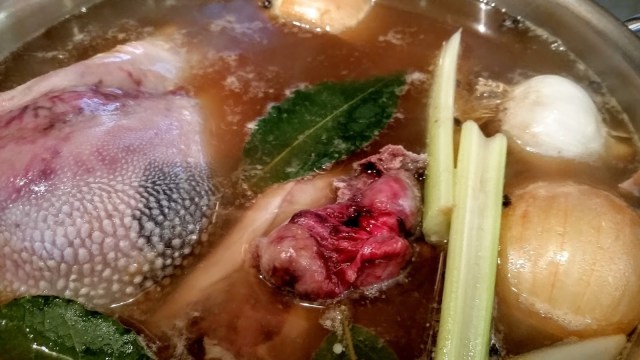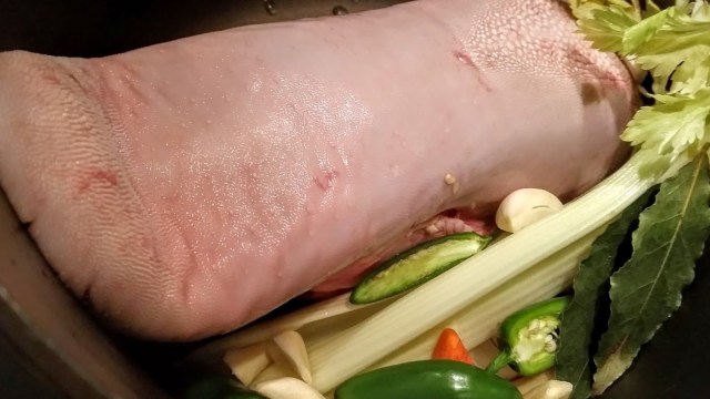 Give the tongue a rinse with cold water. There is often some blood, as we all know if you’ve ever cut your tongue. Put the tongue in a stock pot large enough to hold it. Add two stalks of celery, two carrots, an onion cut in half, about 10 cloves of garlic cut in half, three or four jalapeno or serrano chiles cut in half, two bay leaves, 1T salt and 2t black pepper. Add water to cover everything, and set on Medium heat. When it just starts to boil, cut the heat to low and let it simmer. Simmer the tongue until it is tender. This may take three to four hours.