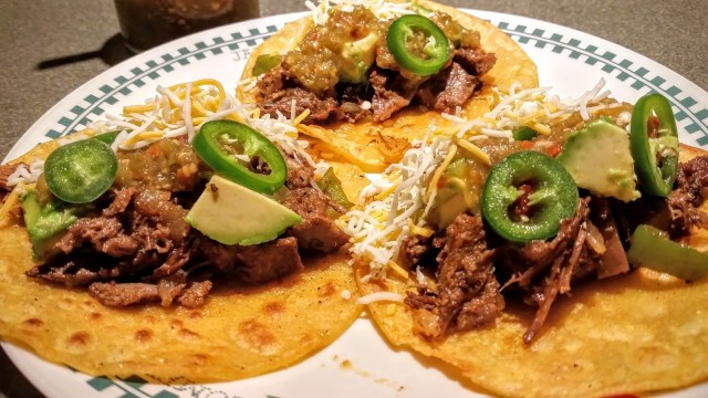 Prepare your condiments for the tacos. I like my home canned salsa verde, shredded cheese, diced avocado, and sliced hot peppers (jalapeno, serrano, or habanero). Some folks like a little cilantro, diced tomato, or a squeeze of lime. Your preference; enjoy!