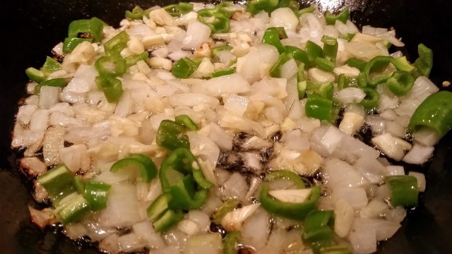 Now heat a skillet over medium-high heat and add 2T golden lard to the pan. You can use vegetable oil or other fat if you want, but lard is the Mexican way and will add flavor. When the fat is hot, add one diced white onion, 3-4 diced fresh green chilies (I happened to have some right from my garden), and about 3-4T minced garlic. Sautee to caramelize and get some good brown color on the edges. Add a little salt to the pan.