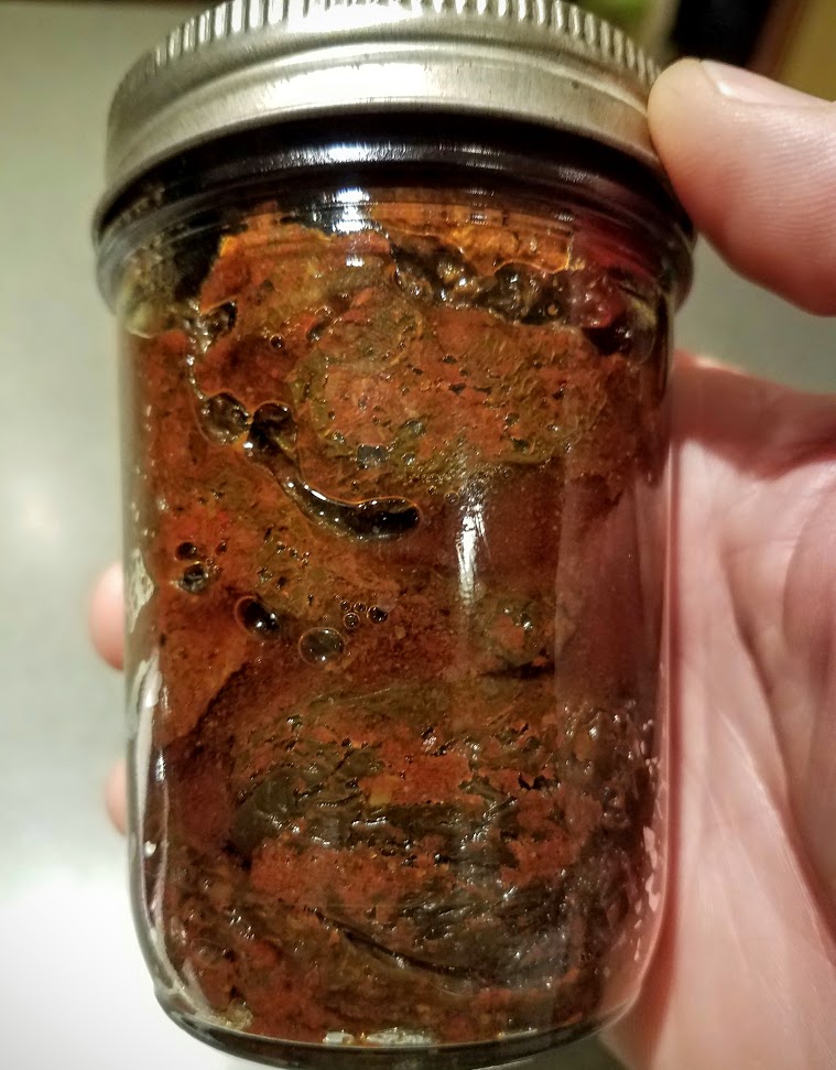 I ended up with about 3 quarts of the red ones in this batch. I trimmed the stems down since I figured they would just take up room in the jars in the end. Then I put the peppers into a Dutch oven with 4 cups (2 pint jars) of my garden canned tomato sauce, 2 cups homemade apple cider vinegar, 1T sea salt, 1T dried Mexican oregano, 2T tomato powder (made from the dried skins and pulp from the tomatoes that went into my sauce), 1t cumin, 1t granulated garlic, 1/4t cloves, 1/4t cinnamon.