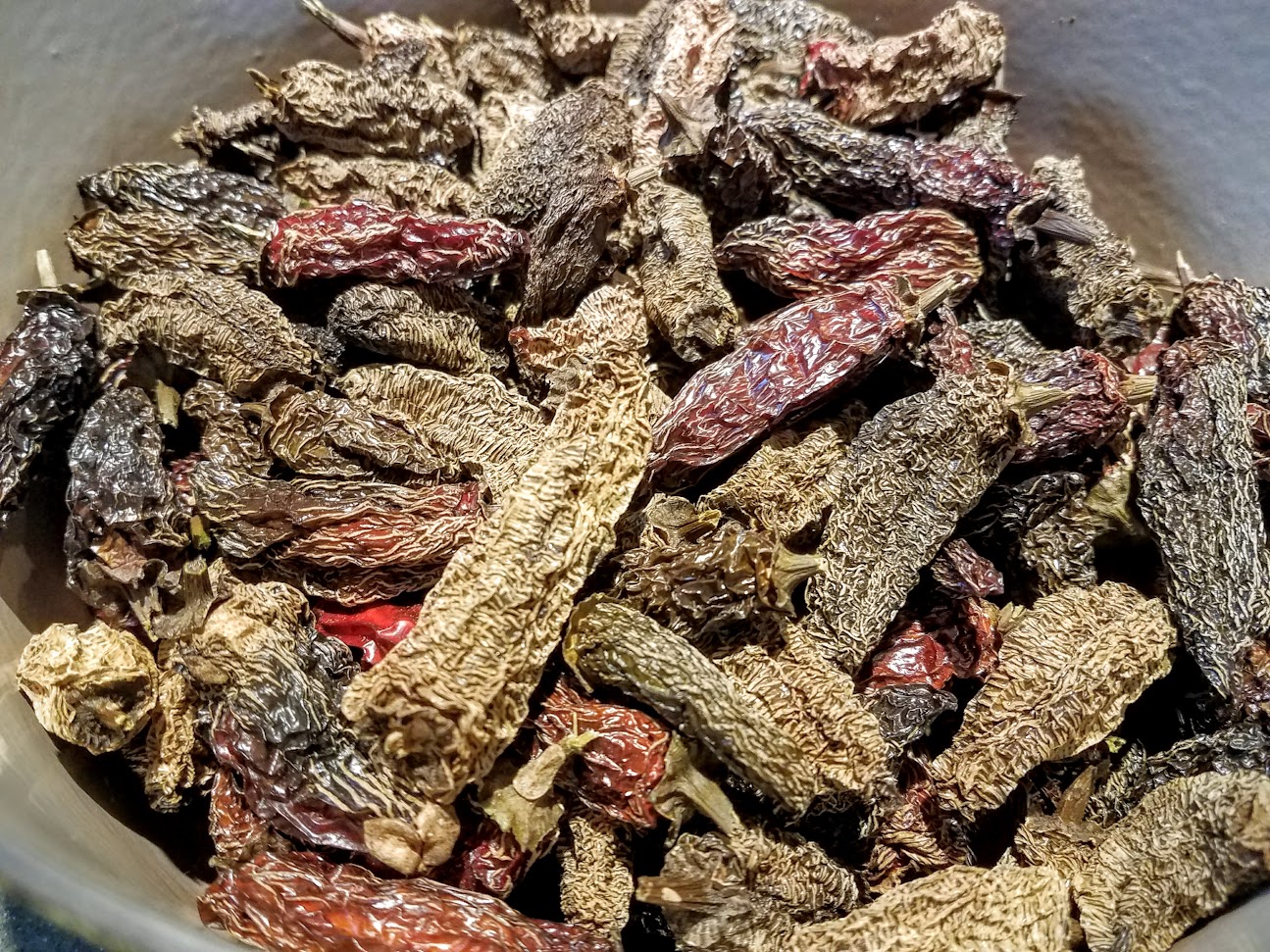 At this point, I sort them again. I set all aside the red ones for this “Project Adobo.” The nicest looking tan ones were set aside for future pots of chili. Any with blemishes went into a pile to be ground into powder.