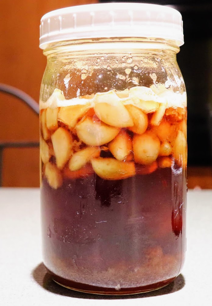The acidity and high sugar content of the honey keeps the garlic from spoiling. The hygroscopic property of honey, its ability to draw water from other items, causes it to “cure” the garlic. There are small bubbles, but little pressure in the jar, so I assume there is some sort of fermentation going on as well.