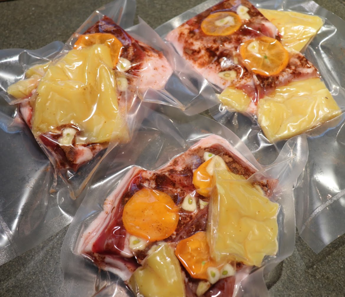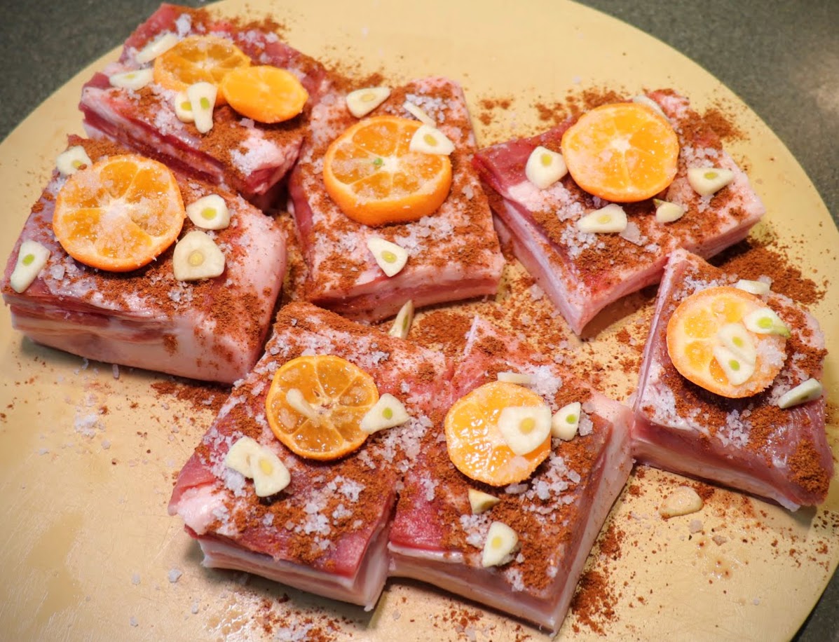 From a nice slab of the belly, I cut 7 nice portions. The rest of the belly, I put in a cure for a pancetta tesa…that will need to go in another post. I generously salted the pieces of pork with some Trapani salt, then applied a dusting of five-spice powder. I layered each piece with slices of calamondin, a type of kumquat, from our tree. We all know pork loves garlic, so slices of fresh garlic from the garden.