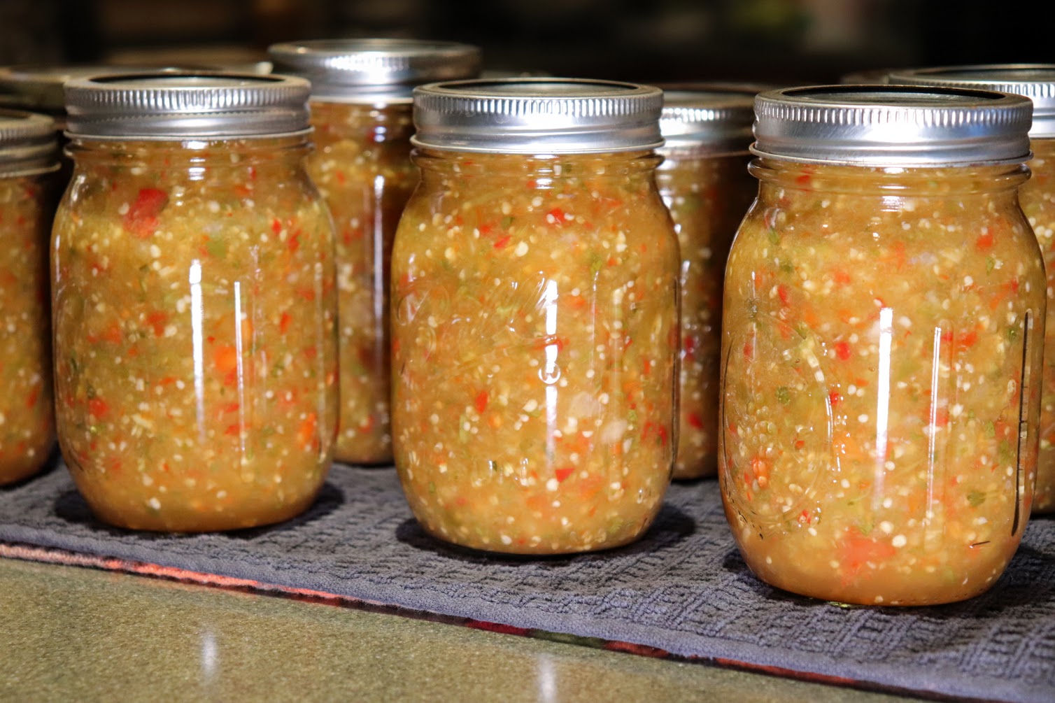 The recipe here makes about 21 pints, enough to fill the typical water canner three times. You can vary the volume to suit your needs and how much produce you have on hand.