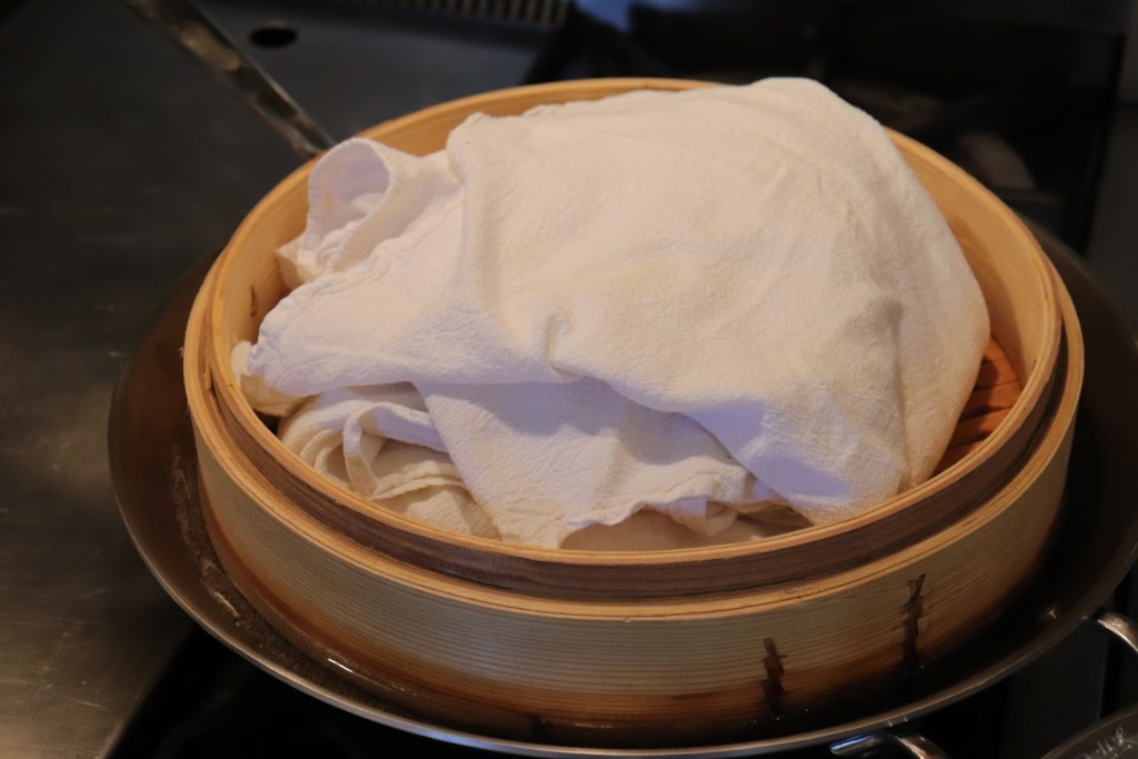 Drain the rice in a colander or large strainer. Lay out two muslin towels, one on top of the other. Lay them in a cross arrangement. place the drained rice in the middle of the top towel and wrap into a package. Place this in a steamer, and steam for about 40 minutes. You want the rice barely cooked through.