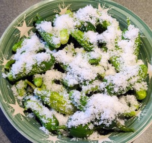 Place the washed cucumbers in a large non-reactive bowl and sprinkle with a good coating of salt. As mentioned in other posts, I am a big fan of tamise grained Korean sea salt. It has the right texture, is relatively inexpensive, and it has a nice salt flavor. Let the cucumbers rest with the salt for 2-3 hours. at the end of the time, rinse well with cool water and drain well.
