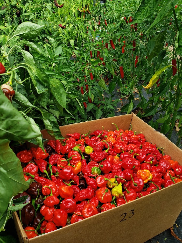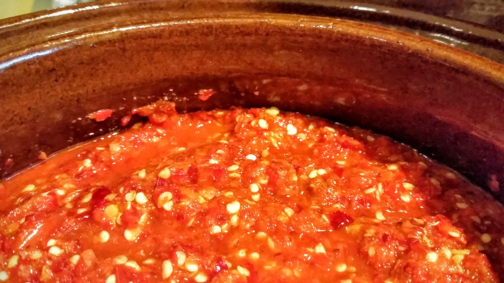 I grow a lot of chilies in my garden. The basis of this sauce is serrano chiles, and heat is provided by red Scotch Bonnets, Red Savina Habaneros, and a few red Bhut Jolokia. You can mix the peppers to suit your own tastes. I once made a batch way too hot, so I started another crock with red bell peppers to ameliorate the heat.