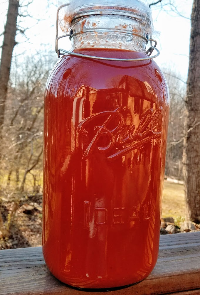 At this point, I use a two gallon mason jar to do a bit of bulk aging. The sauce may stratify a bit. If this happens, I draw off the clear “elixir” from the top of the jar using a turkey baster. I add this elixir to my NC barbecue sauce or to pots of beans, etc. It adds a delicious fermented note to any dish.